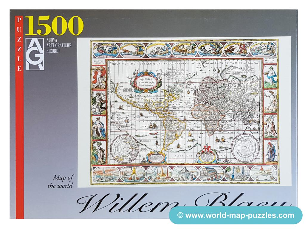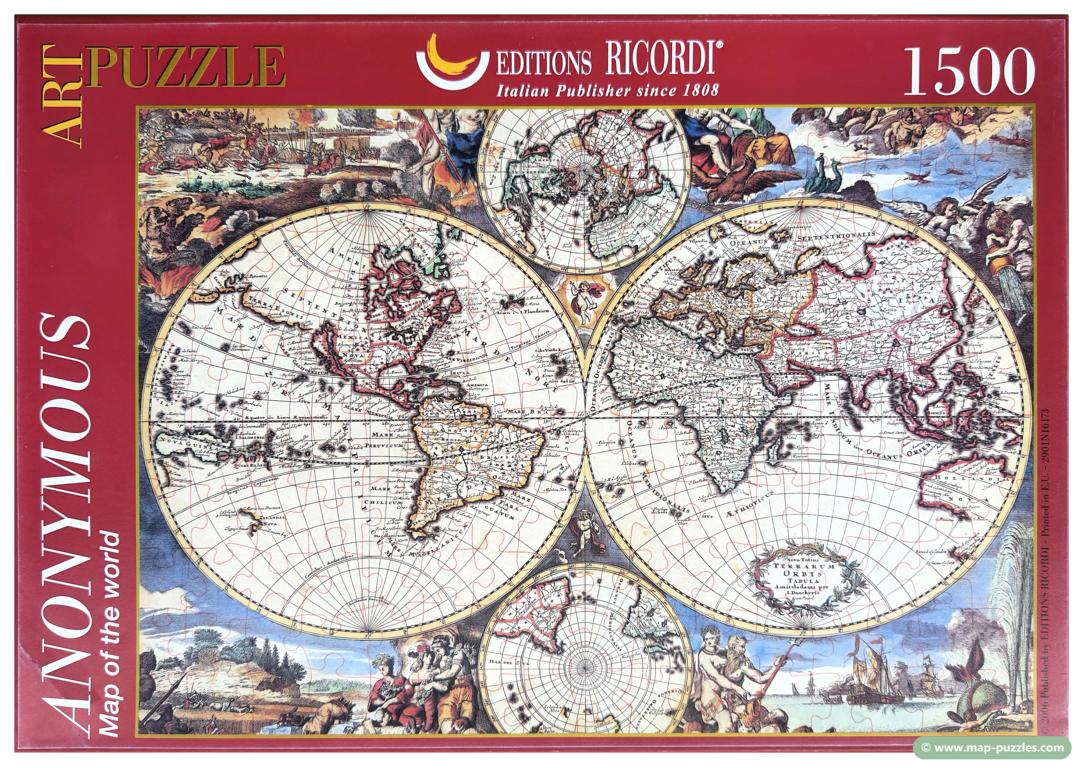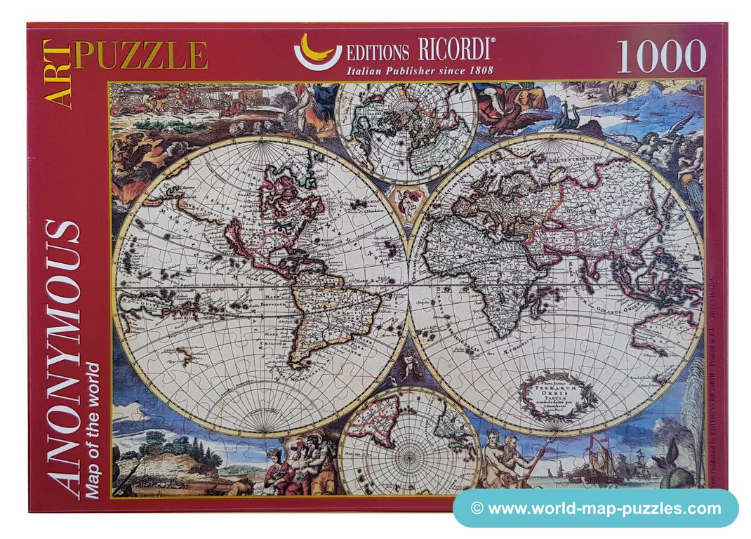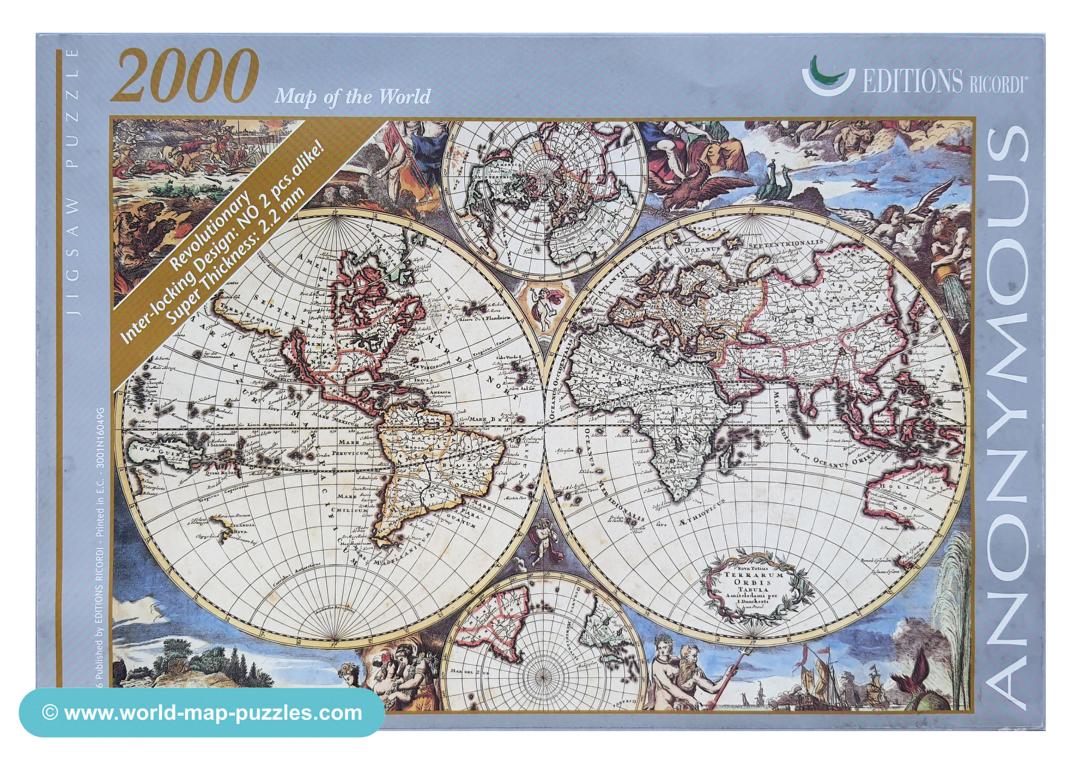 A private collection of modern jigsaw puzzles showing an antique world map.
