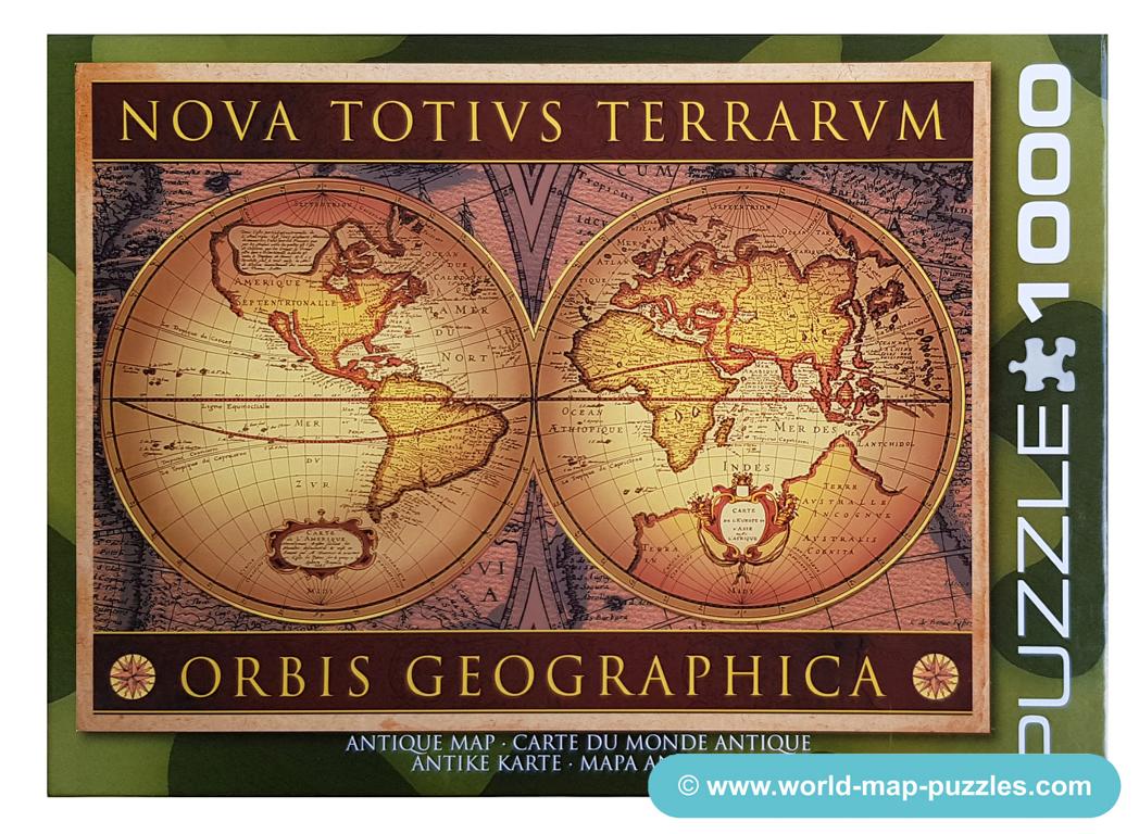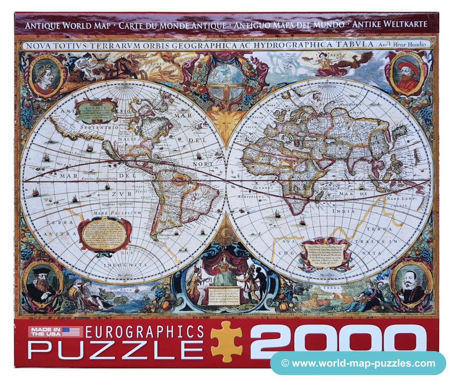 A private collection of modern jigsaw puzzles showing an antique world map.