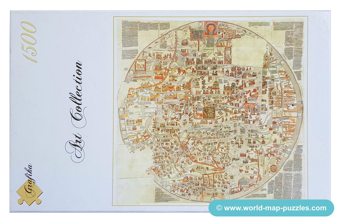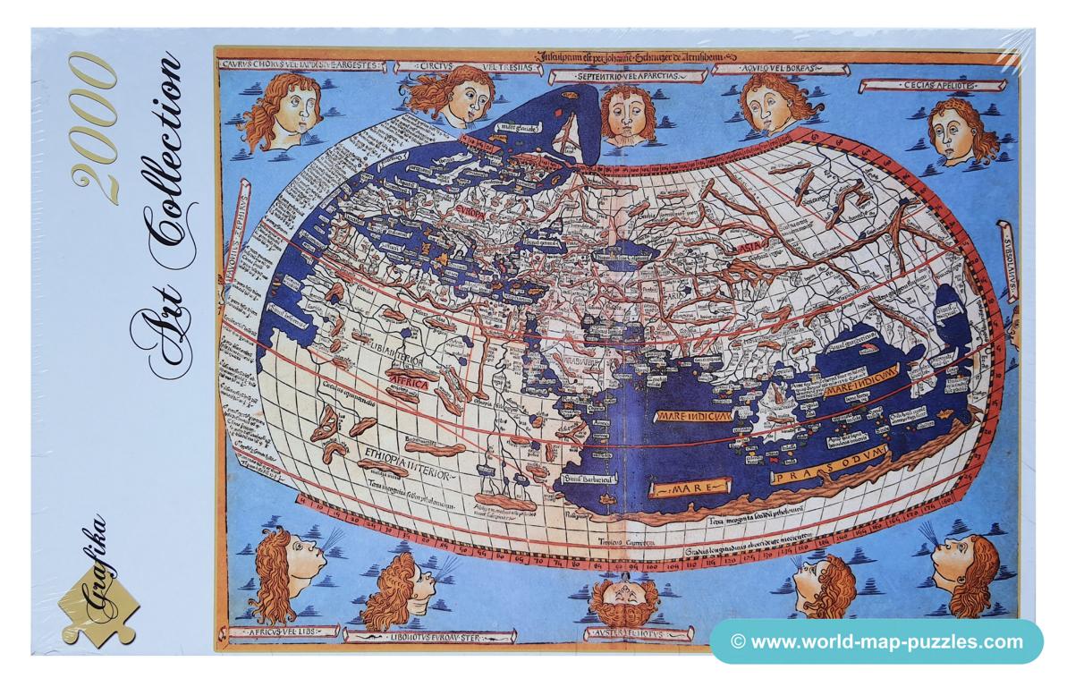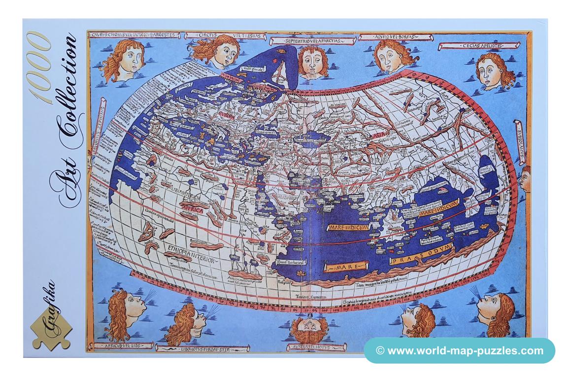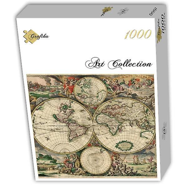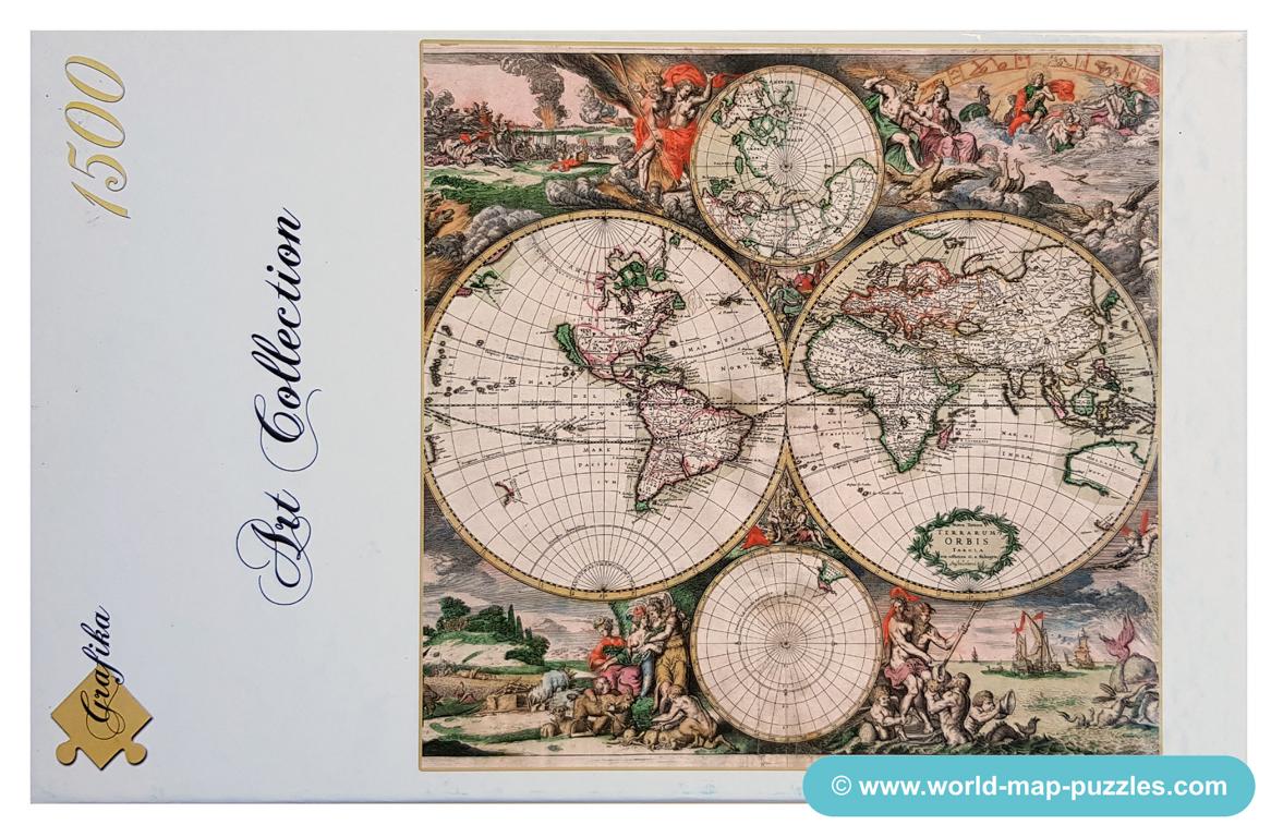 A private collection of modern jigsaw puzzles showing an antique world map.