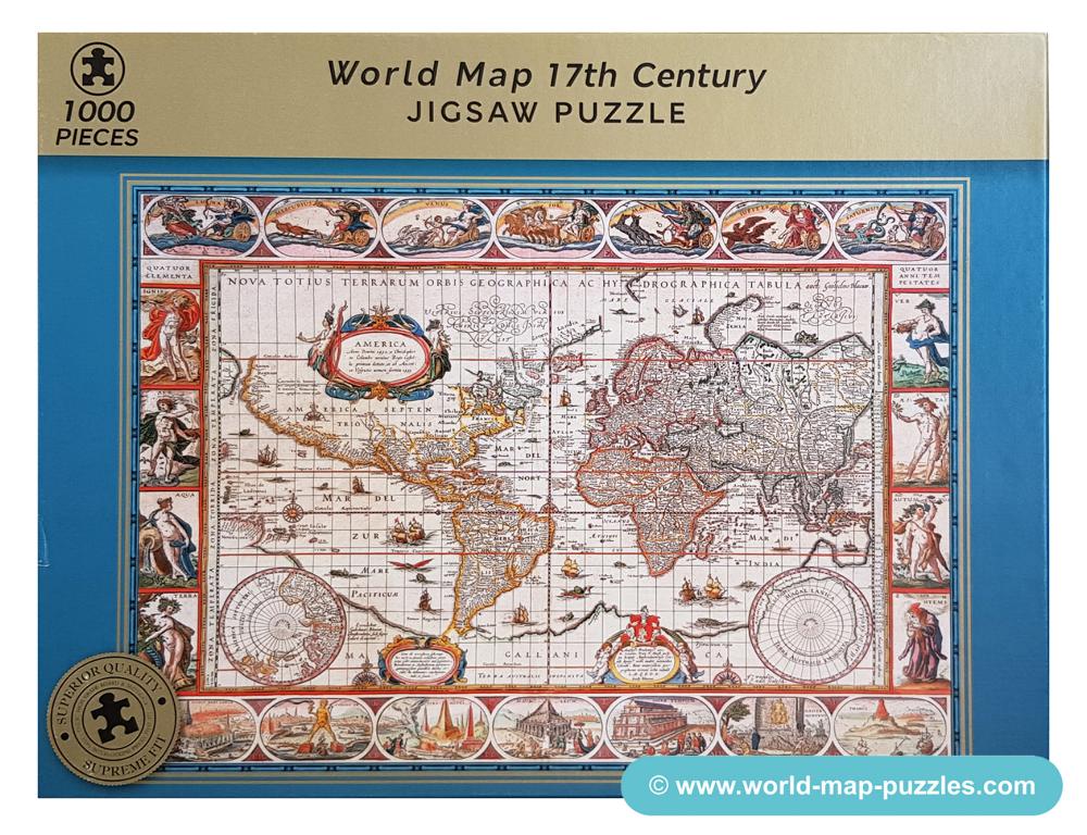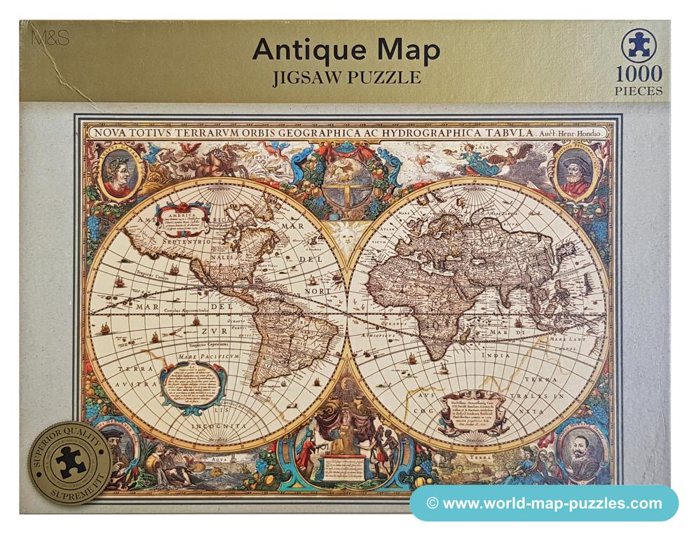 A private collection of modern jigsaw puzzles showing an antique world map.