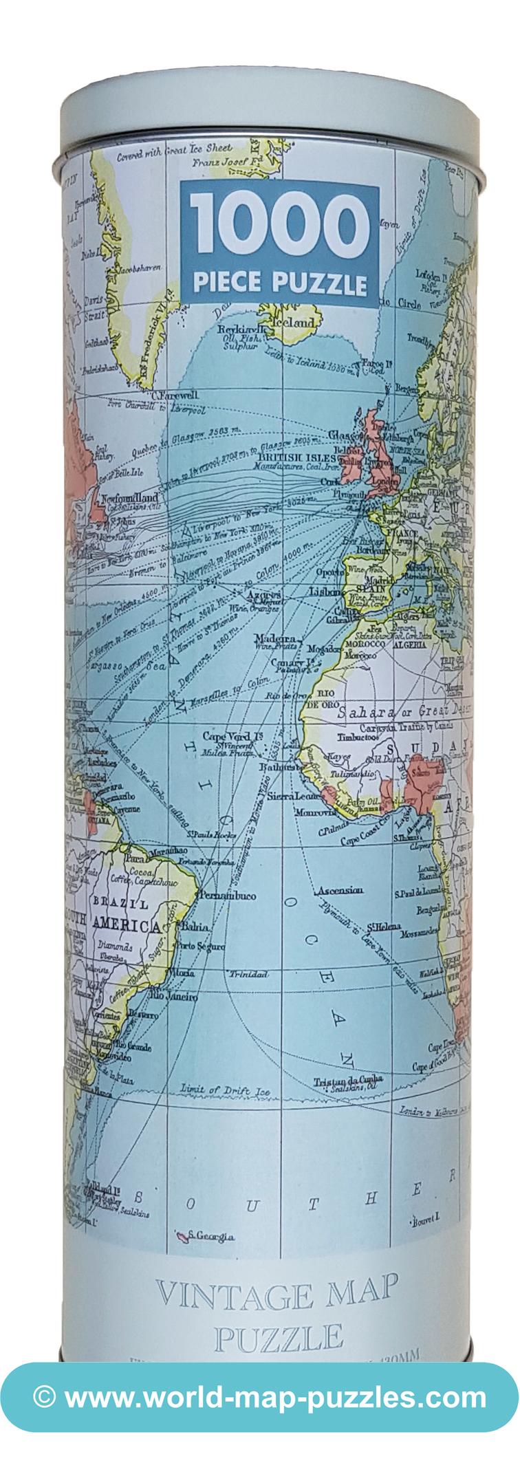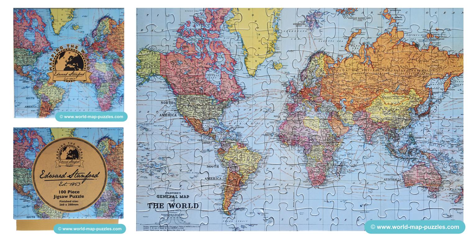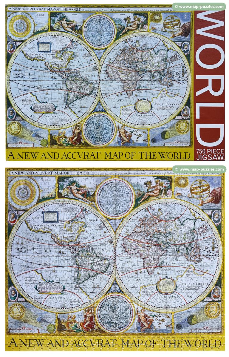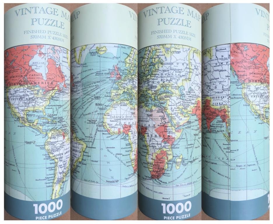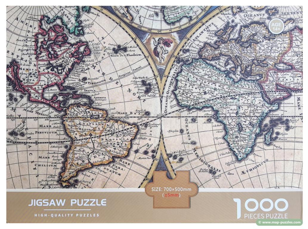 A private collection of modern jigsaw puzzles showing an antique world map.