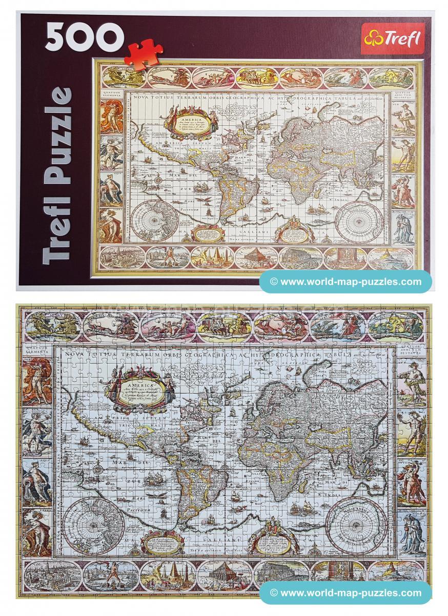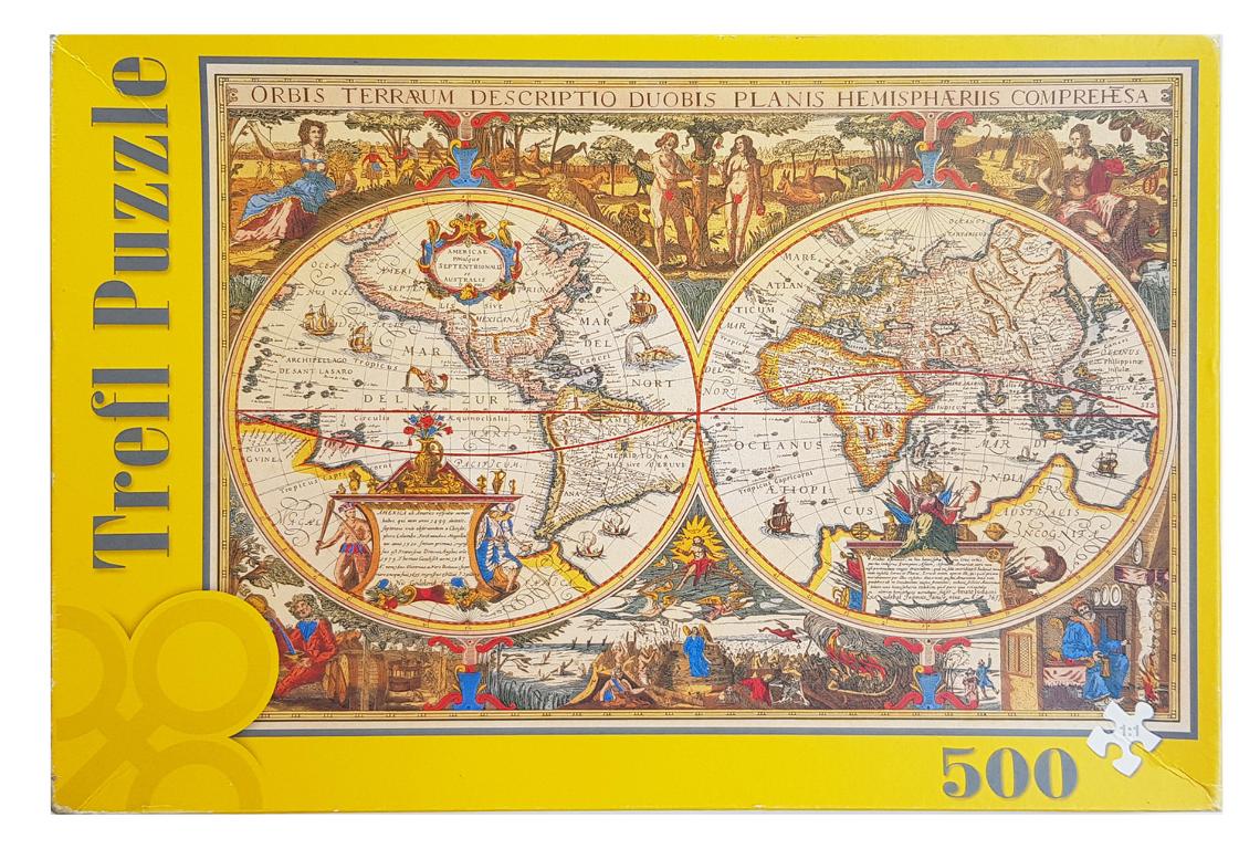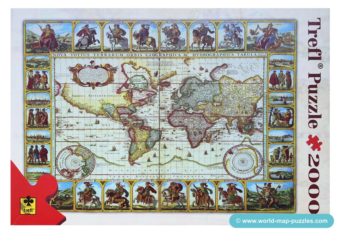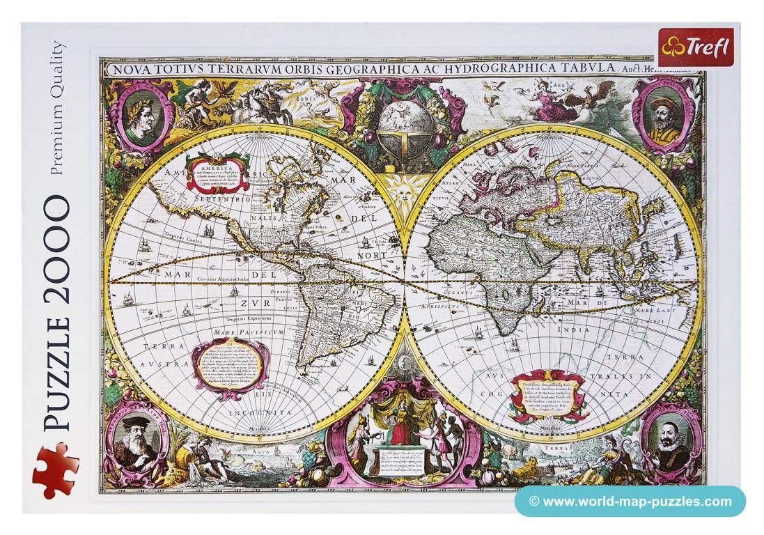A private collection of modern jigsaw puzzles showing an antique world map.