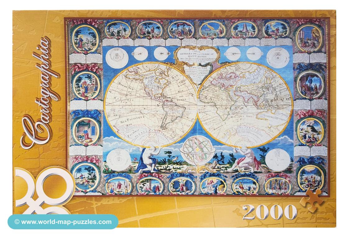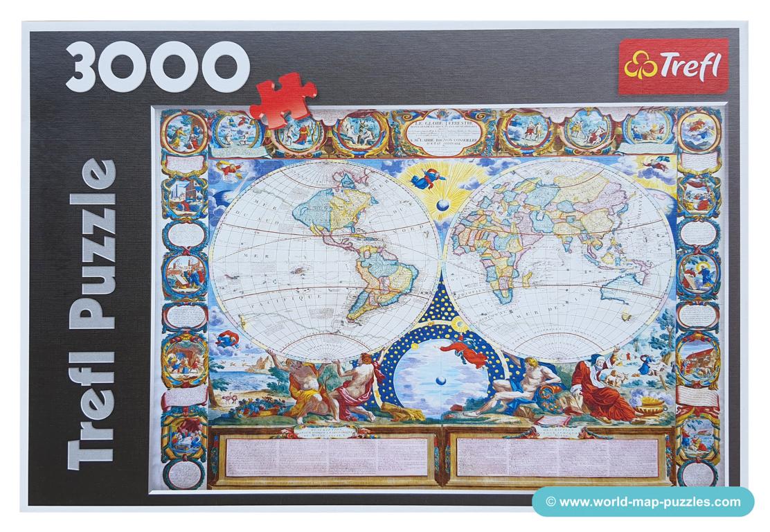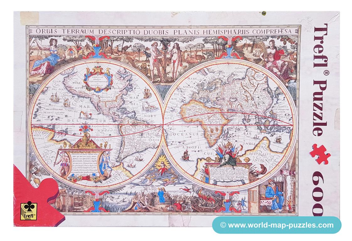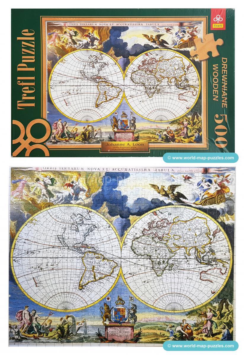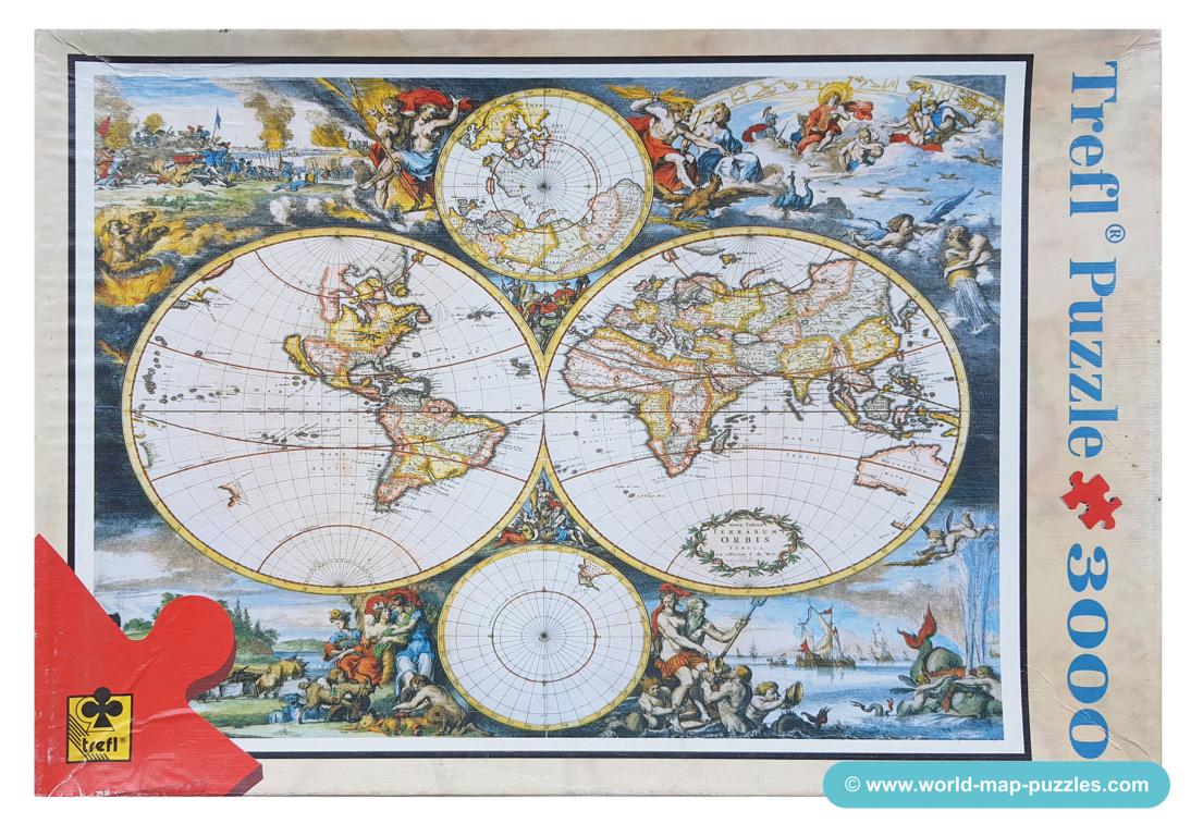 A private collection of modern jigsaw puzzles showing an antique world map.